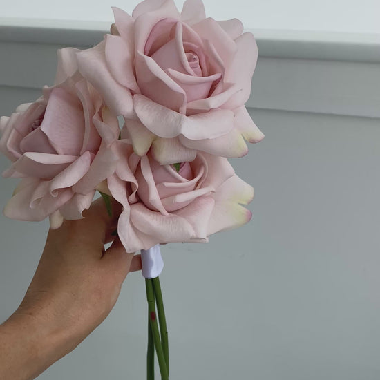 Say hello to the stunning petite pink rose bouquet. This beautiful little bouquet is made of three luxe, real touch blush pink roses.