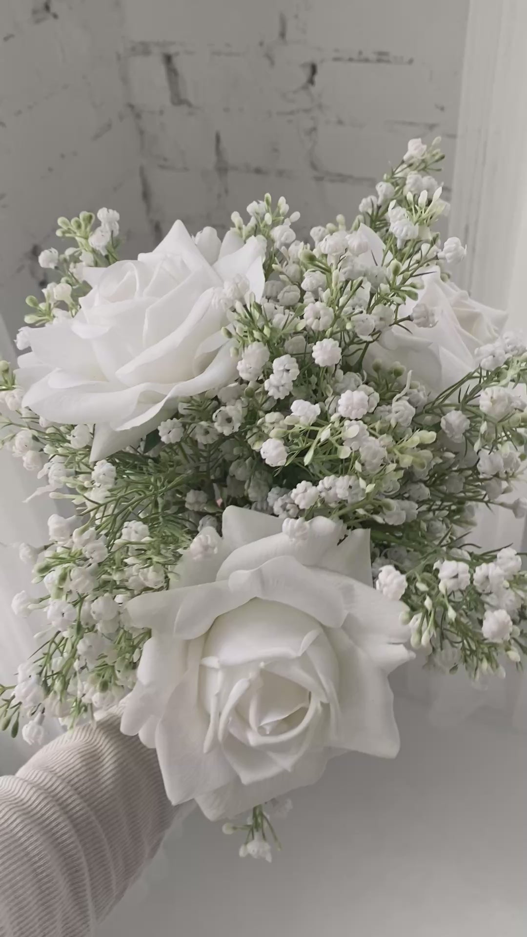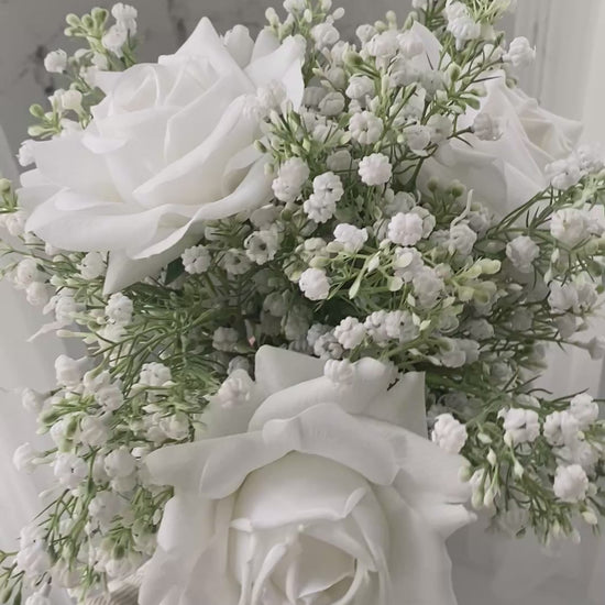 Say hello to the stunning "Meredith" bouquet. This beautiful bouquet is made of lush & luxe, long stem, real touch white roses & accompanying ultra realistic baby's breath.